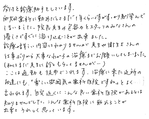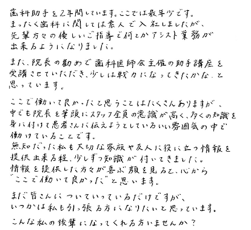 歯科助手募集 現在歯科助手の募集はしていません。 当院で働くメリット 一日の流れ 先輩からのメッセージ 募集要項 歯科助手先輩からのメッセージ 患者さんの喜ぶ顔に心から「ここで働いて良かった!」 自宅近くにこんな良い歯科医院があるとは! 電話での応募お問い合わせ078-594-4182受付時間 10:00~17:00 /木・日休 応募・お問い合わせフォームはこちら 歯科医師募集! 詳しくはこちら 歯科衛生士募集! 詳しくはこちら 歯科助手募集! 詳しくはこちら 受付事務募集! 詳しくはこちら 見学イベントについて